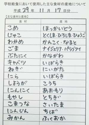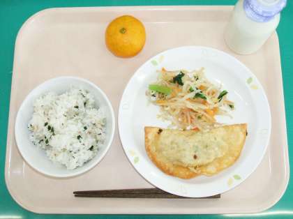 *わかめとじゃこのごはん *ジャンボぎょうざ *塩ナムル *くだもの(みかん) *牛乳