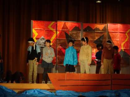 学芸会(4年生) 公開日 2017/11/18 更新日 2017/11/18 4年生 「大きな梅の木の下で〜桃太郎編〜」 みんなで学芸会を作ることになり、悩んでいるところで桃太郎の世界へ迷い込んでしまいます。そこでは、自分たちが知っている桃太郎たちと違う姿が。その後もトラブルに巻き込まれてしまいますが、不思議な梅の木が大事なことを教えてくれます。 友達とどう付き合っていくべきなのか、信念と優しさの大切さを教えてくれる素敵な劇でした。