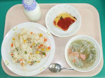 *3色ピラフ *スペイン風オムレツ *キャベツとコーンのスープ *牛乳