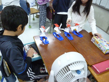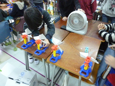 理科の学習は、「風のはたらき」です。実験セットと送風機を使って学習を進めています。前単元で学習したゴムの力とともに、エネルギーに関わる学習です。