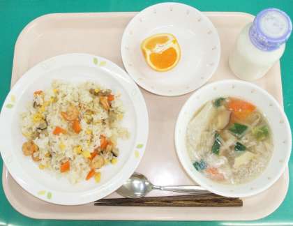 *えびチャーハン *ワンタンスープ *くだもの(はれひめ) *牛乳
