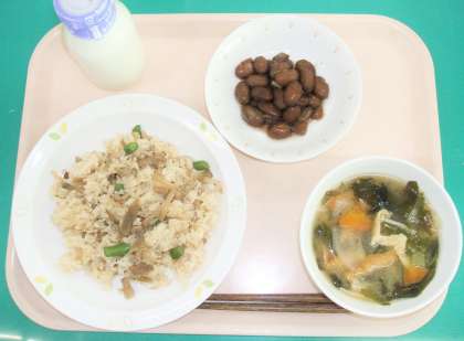 *ぶた肉とごぼうのごはん *うずら豆の煮豆 *みそ汁 *牛乳