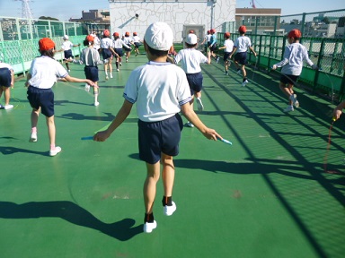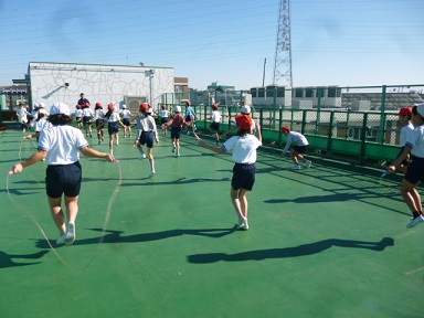 校庭が使えないために、屋上を利用した体育学習をしています。もっとも1月は校庭であっても、なわとびの学習が中心となります。短縄、長縄を使い、いろいろなとび方にチャレンジしています。