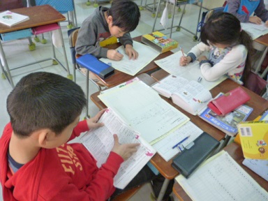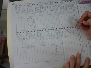 1組では、3時間目の国語の時間に「かるた作り」の学習をしました。50音の一覧表に文字を分担したり読み札の言葉を書いたりします。