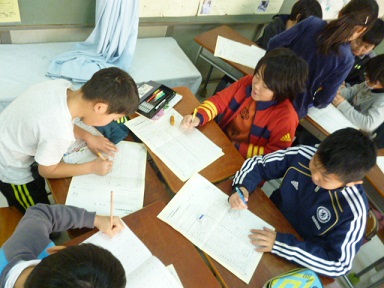 手元に用意している国語辞典を活かして、言葉を探したり感じを確かめたりします。よい言葉や文章が思いつかないと、同じグループの友達と相談します。
