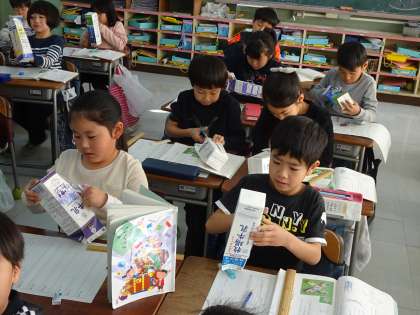 「紙パックで、こまを作ろう」 文章から作り方を読み取って、こまを作る勉強をしています。 上手にできるかな?