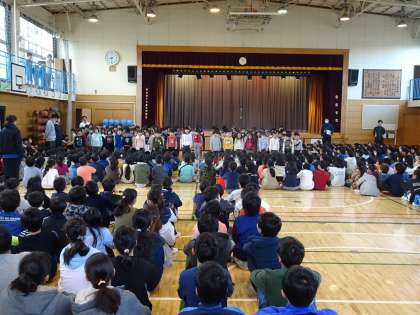 9月から一生懸命覚えた「雨ニモマケズ」。1年生全員が校長先生に暗唱を聞いてもらい合格をもらいました。その成果を学校全体に披露しました。