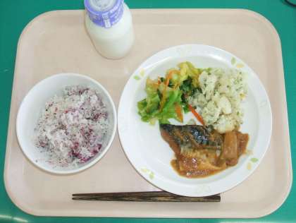 *ゆかりごはん *サバのみそ煮 *野菜のしょうが風味 *磯香ポテト *牛乳
