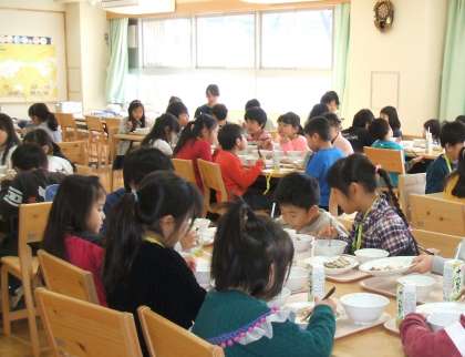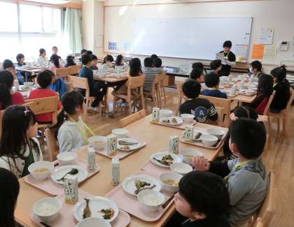 今日は、1−4と2−4が交流しながら給食をいただきました。