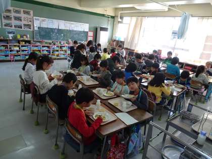 5年生が中心となり、3・4年生が配膳などを行い、みんなで協力して給食準備しました。