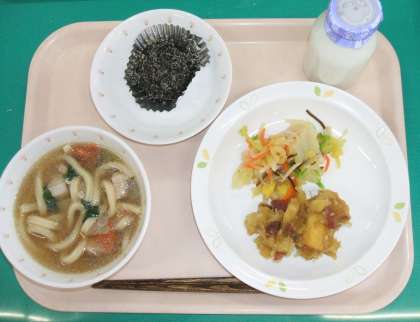 *けんちんうどん *さつまいものにころがし *白菜のゆず風味 *ごまぼたもち *牛乳