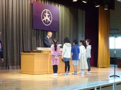 全クラスの代表児童が、校長先生からあゆみと修了証を直接受け取りました。