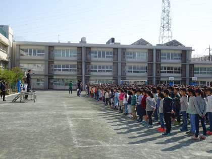 今年度最初の全校朝会です。 転入生の自己紹介がありました。(4月9日)