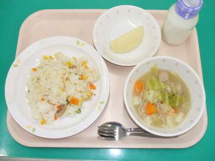 *3色ピラフ *ポトフ *くだもの(りんご) *牛乳