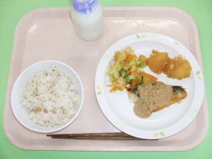 *雑穀ごはん *サバのごまだれかけ *野菜のしょうが風味 *じゃがいもの甘辛煮 *牛乳
