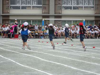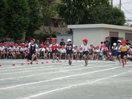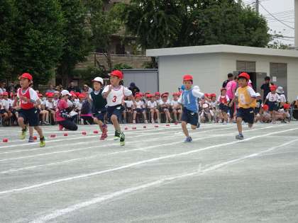 初めての徒競走です。ゴールに向かって真っ直ぐ走ることを頑張りました。