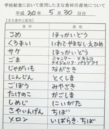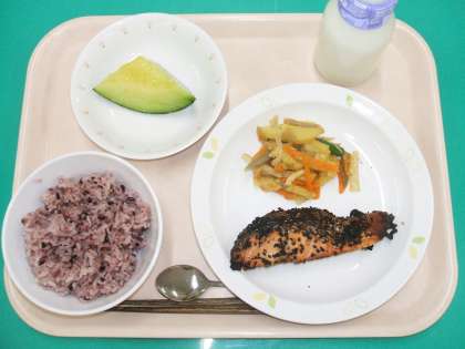 *黒米ごはん *サケの南部焼き *じゃがいものきんぴら煮 *くだもの(メロン) *牛乳