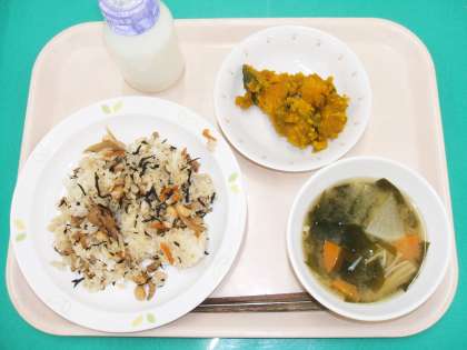 *豆入りひじきごはん *かぼちゃの含め煮 *みそ汁 *牛乳