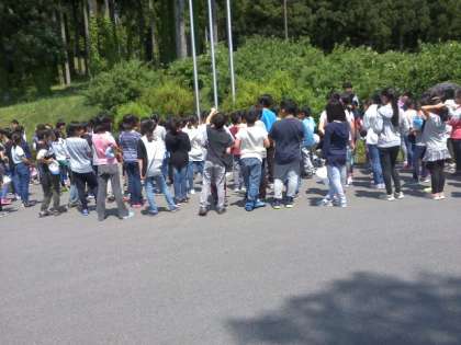移動教室も2日目を迎えました。 宿舎の前で朝会です。体操などをして、体を起こしました。(6月5日)