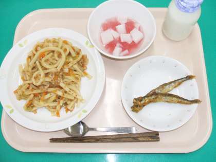 *焼うどん *ししゃものカレー揚げ *あじさいゼリー *牛乳