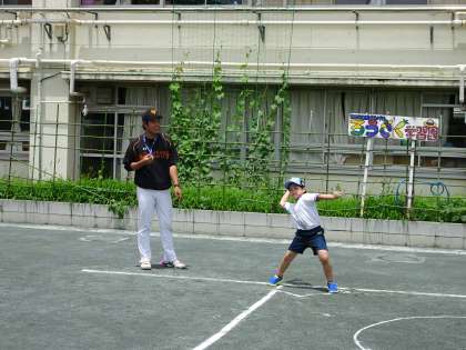 はじめに、投げる練習です。腕の振り方などのコツを聞いて、いざ練習。意識して投げられました。