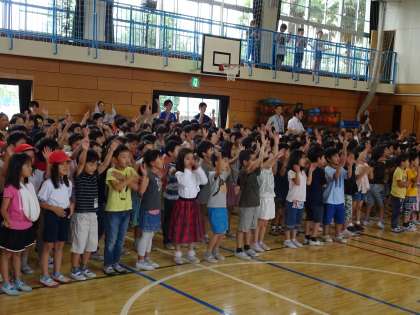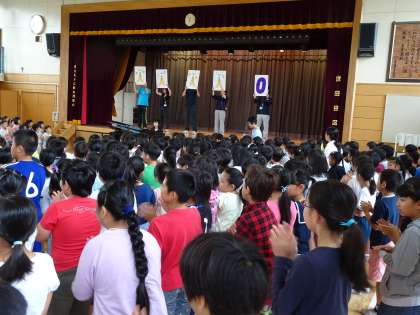 音楽朝会 公開日 2018/06/15 更新日 2018/06/15 音楽 今月の歌は「こいぬのBINGO」です。 歌詞の「BINGO」の「B」のところで手を叩きます。次は「B・I」のところで手を叩きます。 曲が進むにつれて、手を叩く箇所が増えていくという曲です。 手を叩くだけでなく、足踏みしたり手を広げたりしてリズムを感じました。(6月14日)