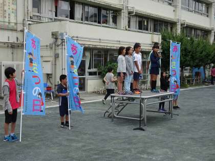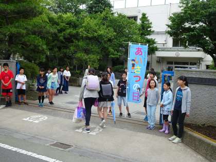 計画委員と各委員会の委員長が中心となって、校門の前に立ちみんなに挨拶をしています。