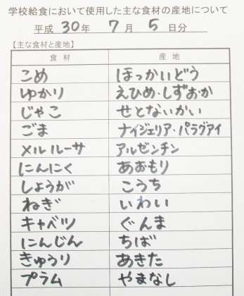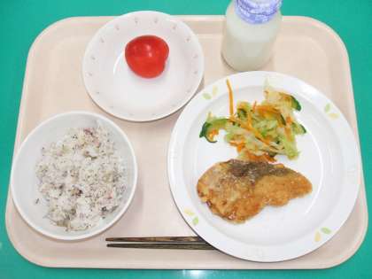 *ゆかりじゃこごはん *魚の七味あげ *野菜のしょうが風味 *くだもの(プラム) *牛乳