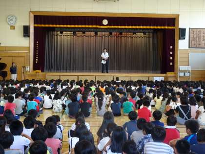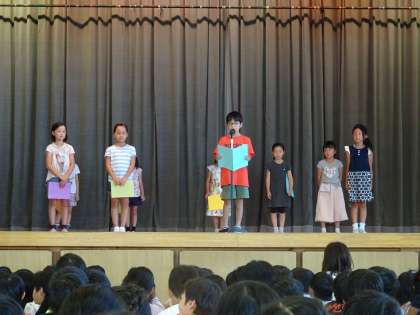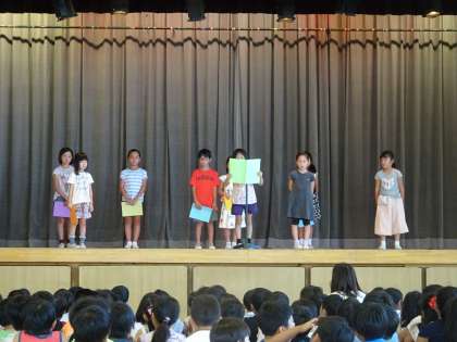 暑さが懸念されていたので、時間を早めて行われました。それでも少し暑い体育館でしたが、子供たちはしっかりと校長先生の話、児童代表の言葉、丸山先生の夏休みの過ごし方などの話を聞けていました。