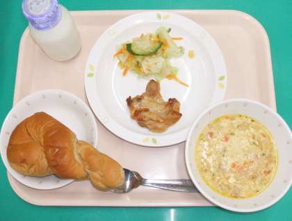 *黒ざとうパン *タンドリーチキン *コールスローサラダ *トマトと卵のスープ *牛乳