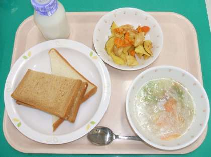 *2色サンド *ベーコンと白菜のスープ *野菜チップス *牛乳