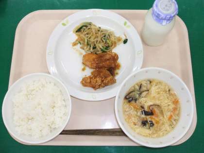 *ごはん *油淋鶏 *もやしのごま風味 *酸辣湯 *牛乳 今日の給食はオリ・パラ給食「中国」です!