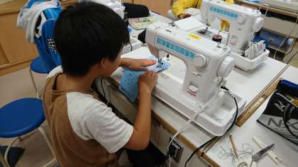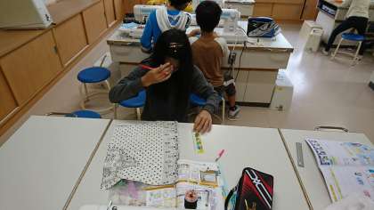5年2組の授業です。 展覧会の作品づくりに向けて、ミシンの練習です。(9月26日)