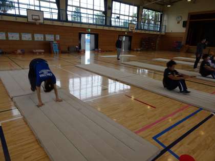 オリンピック・パラリンピック教育の一環として、駒澤大学の先生や学生に来校していただき、マット運動の授業を行いました。