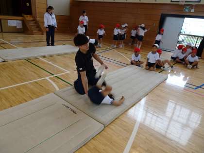 跳ぶ運動や逆さまになる運動、いろいろな回転をする運動など様々な感覚を運動を行いました。少し難しいことも大学生に手伝ってもらいながら、少しずつ上手になっていきました。