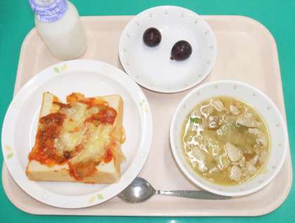 *ピザトースト *白いんげんのうなか風スープ *くだもの(巨峰) *牛乳