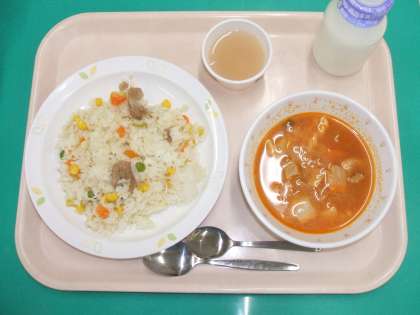 *三色ピラフ *ミネストローネ *りんごゼリー *牛乳