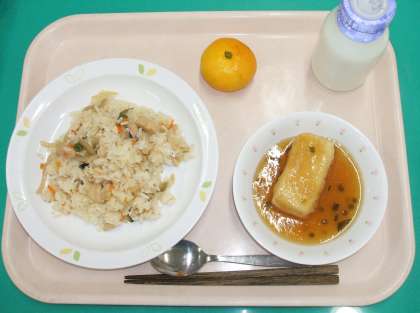 *とり五目ごはん *揚げ出しどうふ *みかん(みかん) *牛乳