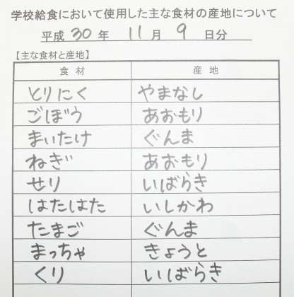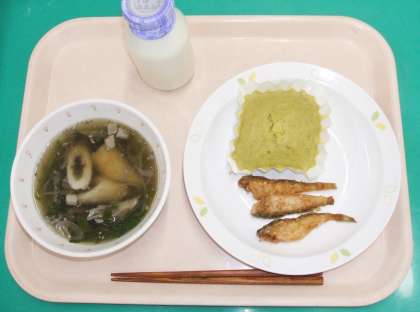*きりたんぽ鍋 *ハタハタのから揚げ *くりまっちゃ蒸しパン *牛乳