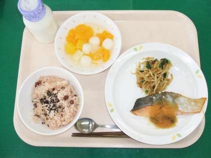 *お赤飯 *鮭の塩焼き大根おろしかけ *菊花おひたし *白玉入りフルーツポンチ *牛乳
