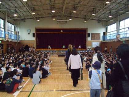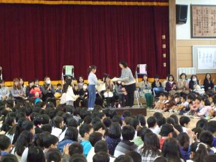 感謝のお手紙を渡し、全校児童で「夢の世界を」を合唱しました。