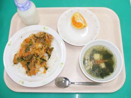 *キムチ丼 *わかめスープ *くだもの(早香) *牛乳