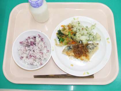 *ゆかりごはん *サバの南蛮揚げ *野菜のおかか和え *磯香ポテト *牛乳