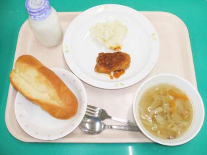 *ソフトフランスパン *ぶた肉のプロバンス風 *じゃがいものクリーム煮 *スープジュリエンヌ *牛乳