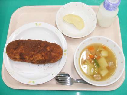 *ココア揚げパン *白いんげんのいなか風スープ *くだもの(りんご) *牛乳