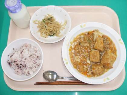 *黒米ごはん *生あげのそぼろあんかけ *もやしのごま風味 *牛乳
