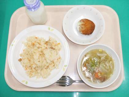 *ツナライス *キャベツとコーンのスープ *かぼちゃドーナツ *牛乳