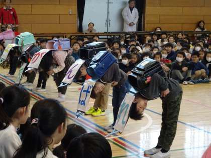 1年生は、6年生との思い出を振り返り、歌のプレゼントをしました。メッセージがランドセルに書いてあって、かわいかったです。