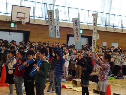 2年生は、4年生の時に作った「おはやし」の曲に合わせて6年生のかっこいいところを伝えました。声が揃っていて、6年生も驚いていました。