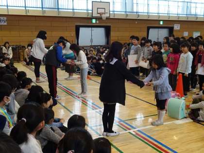 3年生は、3年生の頃を思い出してもらうクイズを出し、しおりをプレゼントしました。しおりは、中学校でも使えるので、よいプレゼントですね。